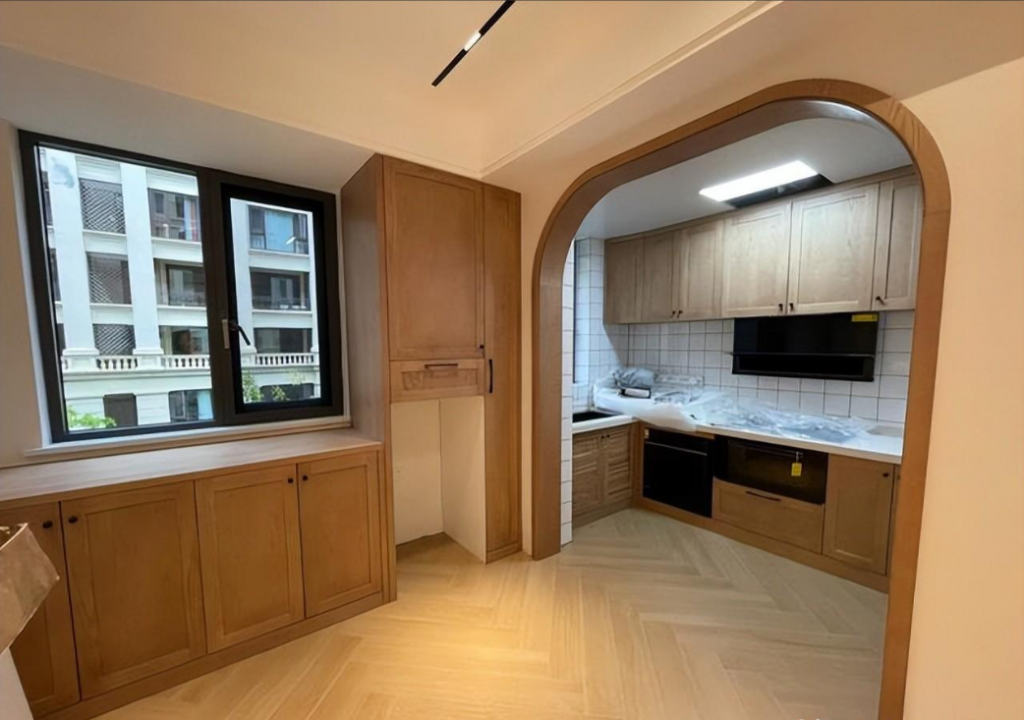 这是餐厅,站在这个角度也是可以看到厨房的哈。利用窗户的位置,设计了餐边柜,可以提供蛮不错的储物空间,很实用,刚好把仅有的空间利用起来。原木色,显得很温馨。把门洞改拱形,显得比较个性,大气!