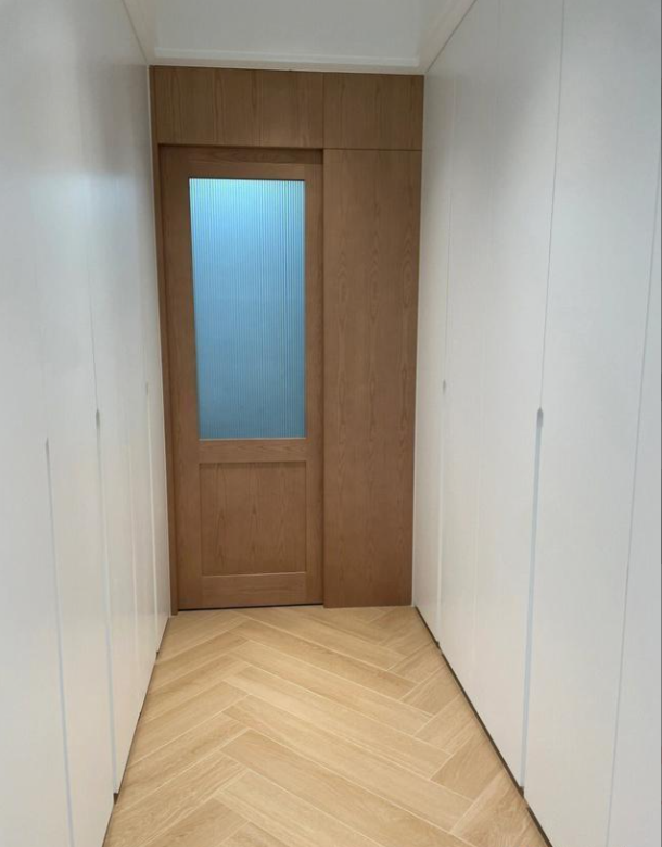 这是小小衣帽间,两边的衣柜直接到顶,显得比较大气。家里如果也喜欢仿实木木纹石晶地板的话,除了厨房与卫生间之外,都可以选择铺贴仿实木木纹石晶地板呢。最后等家居入场,整体效果就都出来了。