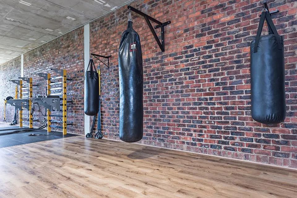 这家健身房的装修风格采用的是简约时尚的工业风,墙体采用裸露的红砖墙造型,地板采用的是小蓝鲸石晶静音系QT201原木色,室内采光和通风良好,整体风格更接近自然环境,仿佛一个露天开放式的运动场地,让人们在健身的同时,少了一些压迫感,而多了一些放松感。