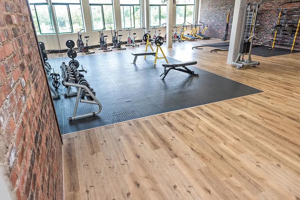 5. spc石晶地板:主要应用在没有器械训练的环境中,丰富的木纹、石纹可以满足健身房装修风格的需要,防水防滑抗菌的特性更好满足安全需求,无尘快装缩短工期,减少工时。