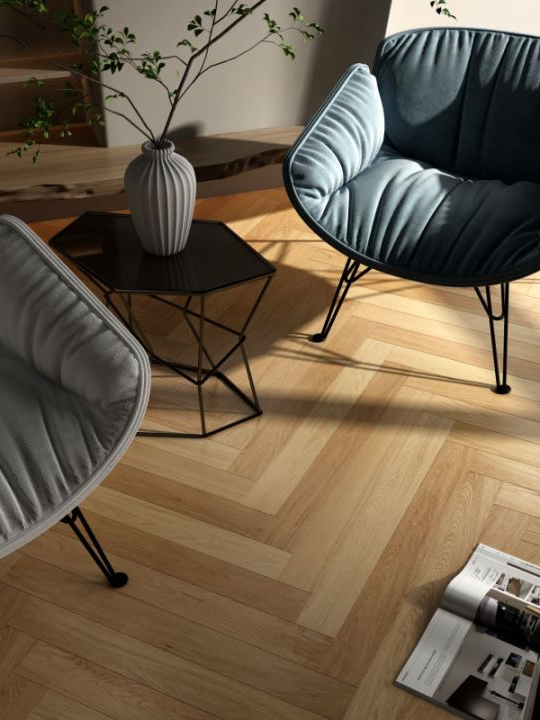 柞木的颜色呈浅杏黄色,柞木的自然纹理非常独特,社红色木纹非常清晰美观,柞木还具有端庄沉稳、典雅古朴的优点。人字拼地板因为多了交错的线条效果,不仅能呈现木材质特有的纹路肌理,深浅不一的木条也往往让单一的空间更多了层次,多了立体的纹理,空间更显精致。比传统直线型铺法的地板美观、立体感强,地板之间排列错落有致,大气又独具个性,给室内空间增添了一丝趣味。