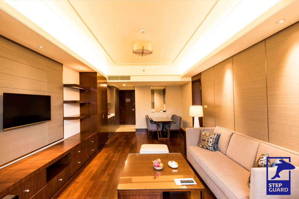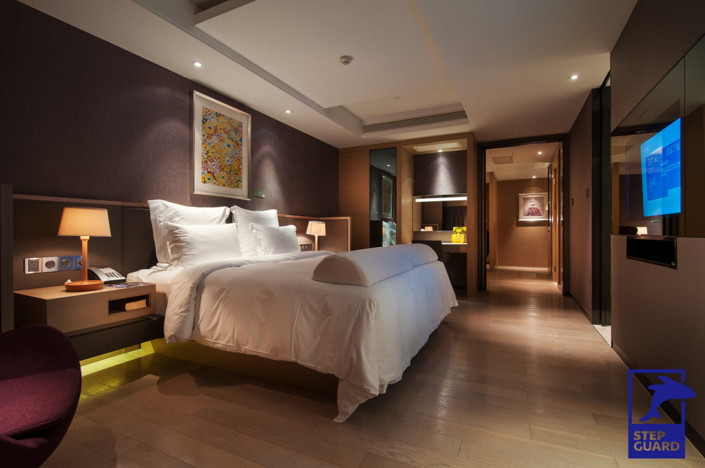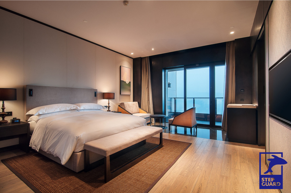 酒店是客人休息的地方,要为客人提供舒适的休息氛围,一般的地板走路会有嘎嘎的声响,这也是很多酒店不想铺装地板,铺地毯的原因,但是小蓝鲸石晶地板具有静音降噪的功能,,采用IXPE静音地垫技术,符合STC 73 / IIC 72dB的隔音测试标准,从此不用担心会打扰到别人,客人能够安心的休息。